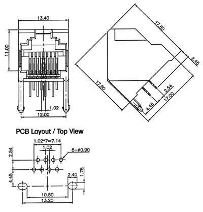 Modular jack, 45 degree, mini, 8 positions, unshielded, PCB mount