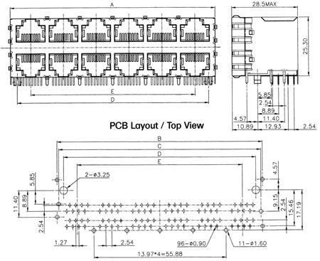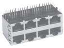Modular jack, side entry, double level, 4 or 6 ports, 6 or 8 positions, PCB mount
