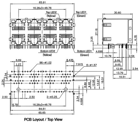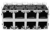 Modular jack, side entry, double level, 1 or 4 ports, 8 or 10 positions, with LED, PCB mount