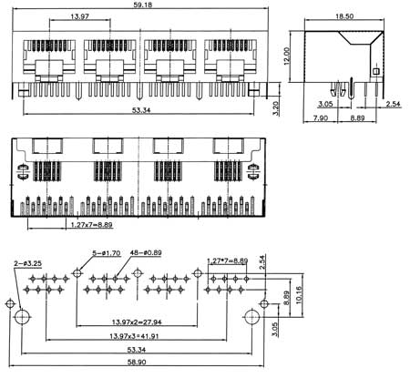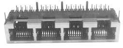 Modular jack, side entry, single level, 4 ports, 8 & 10 pos., shielded, PCB