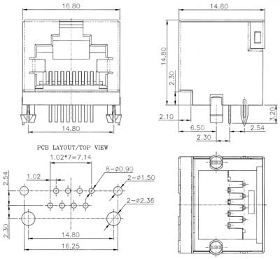 Modular jack, side entry, single level, pin reversed, 6 or 8 pos., shielded, PCB