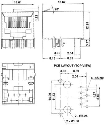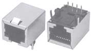 Modular jack, side entry, single level, 6 or 8 pos., shielded, PCB