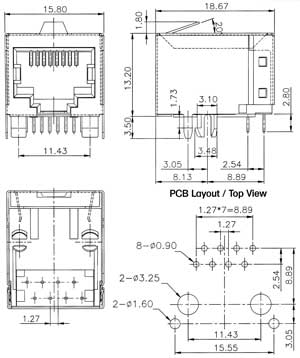 Modular jack, side entry, single level, 8 pos., shielded or unshielded, PCB