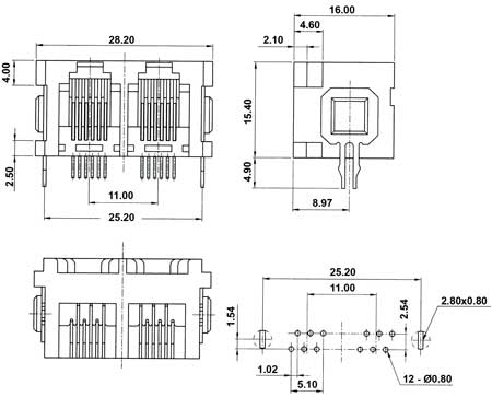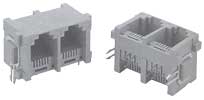 Modular jack, side entry, single level, dual port, 6 pos., unshielded, with metal peg, PCB