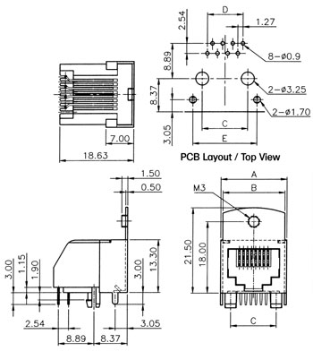 Modular jack, side entry, single level, low profile, shielded, with screw hole, PCB