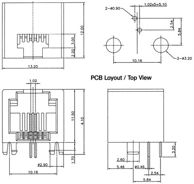 Modular jack, side entry, single level, up latch, RJ11, unshielded, PCB