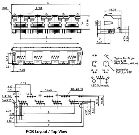 Modular jack, side entry, single level, 4 ~ 8 ports, 8 or 10 positions, with LED, shielded, PCB