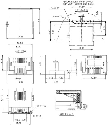 Modular jack, side entry, single level, 8 pos., 2 ~ 8 contacts, embedded, shielded, PCB