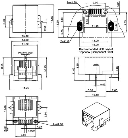 Modular jack, side entry, single level, 4 or 6 pos., 2 ~ 6 contacts, embedded, shielded, surface mount