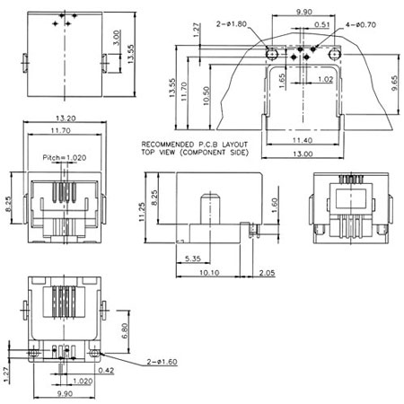 Modular jack, side entry, single level, 4 or 6 pos., 2 ~ 6 contacts, embedded, unshielded, PCB