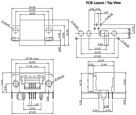 Modular jack, side entry, single level, single, 4 contacts, data link, shielded, PCB