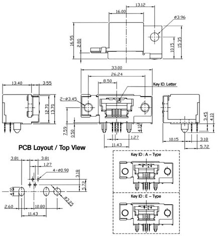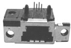 Modular jack, side entry, single level, dual port, 4 contacts, data link, shielded, PCB
