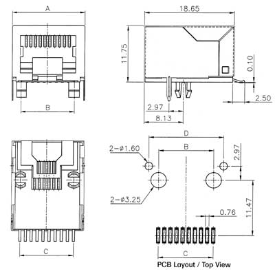 Modular jack, side entry, single level, very low profile, unshielded & shielded, surface mount
