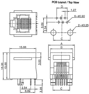 Modular jack, top entry, 4 ~ 8 positions, unshielded, PCB mount