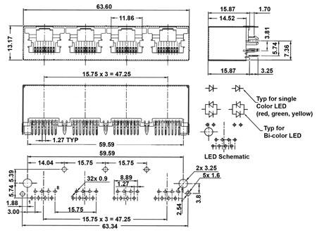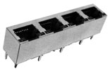 Modular jack, top entry, 4 ports, 8 positions, shielded, with LED, PCB mount