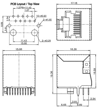 Modular jack, top entry, CAT5, 8 or 10 positions, shielded, PCB mount