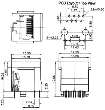 Modular jack, top entry, CAT5, 8 or 10 positions, shunted, PCB mount