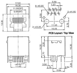Modular jack, top entry, CAT5, 6 or 8 positions, shielded, PCB mount |